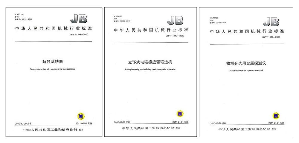 日前,公司負責起草的《超導除鐵器》,參加起草的《物料分選用金屬探測儀》和《立環式電磁感應強磁選機》等3項國家機械行業標準由機械工業出版社出版發行。