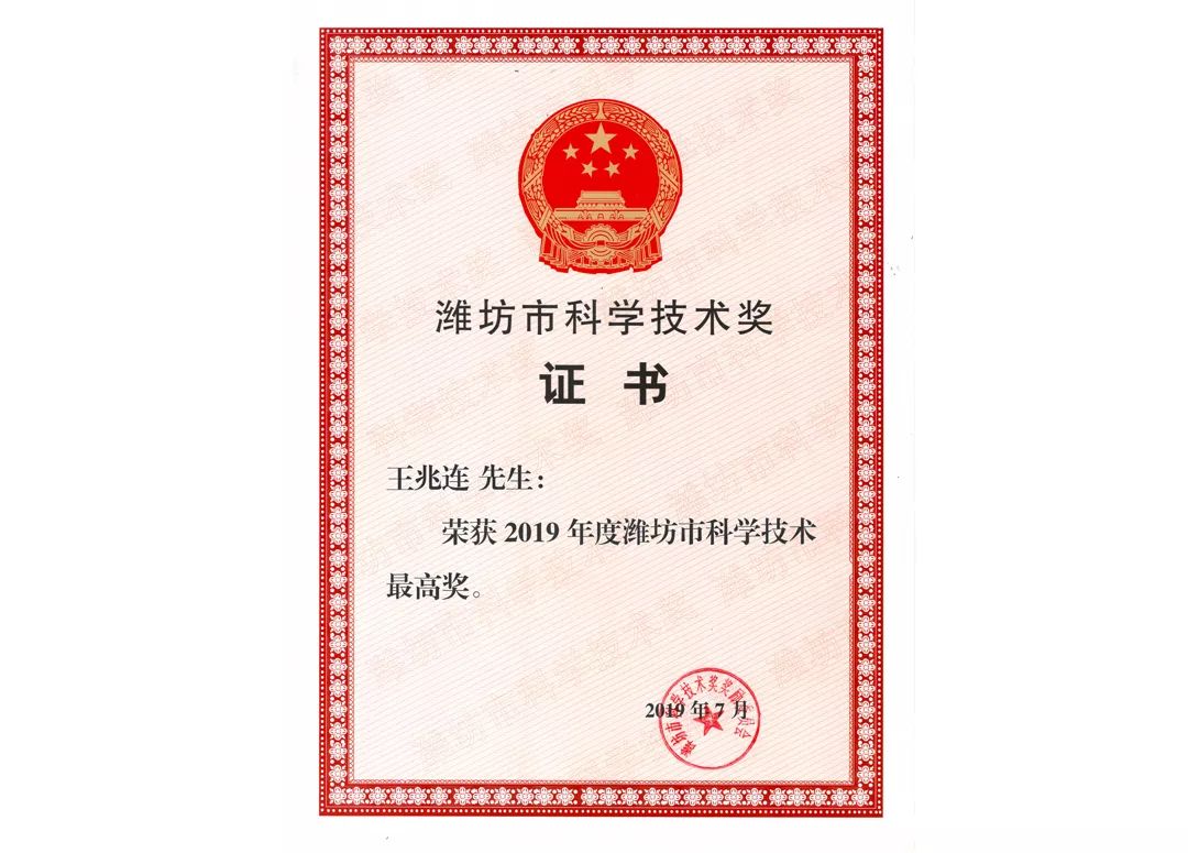 近日,濰坊市科學(xué)技術(shù)獎勵委員會辦公室公布了2019年度濰坊市科學(xué)技術(shù)獎授獎項(xiàng)目人選,華特磁電董事長王兆連被授予2019年度濰坊市科學(xué)技術(shù)最高獎。